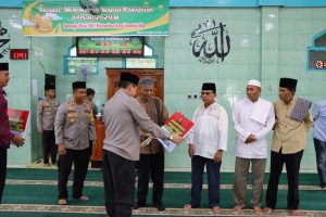 Di akhir acara Kapolda menyerahkan bantuan kepada para pengurus Masjid Darussalam berupa Al-Quran 10 buah, Karpet 5 Gulung, Semen 50 sak dan uang tunai Rp. 10 juta. (ikh)